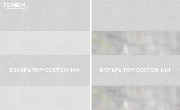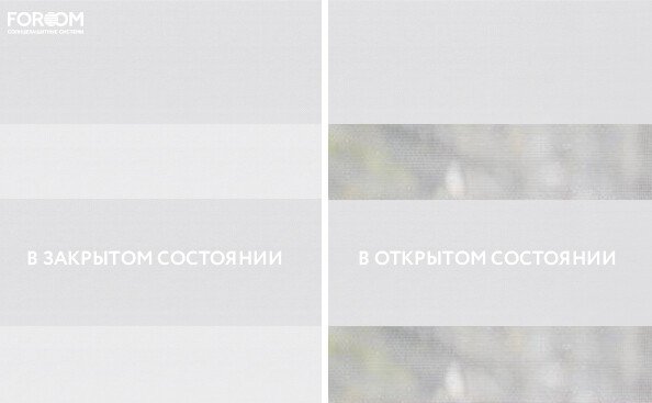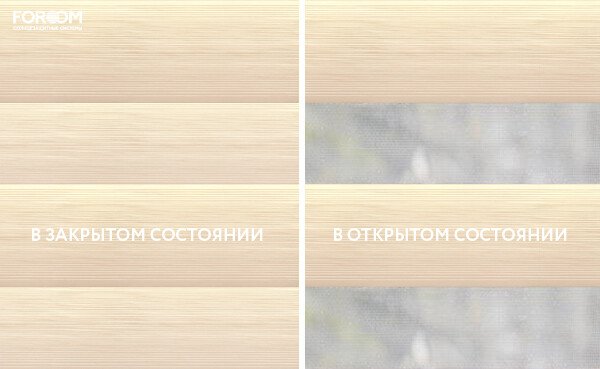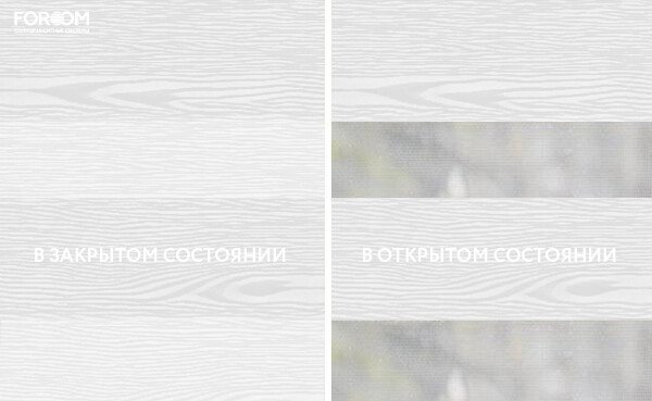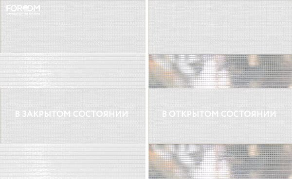 Полотно ткани, состоит из чередующихся горизонтальных полос – прозрачных и непрозрачных. Изменяя положение этих полос относительно друг другу, можно создать целых 3 режима регулировки светом. Например, чтобы в помещении стало светлее, нужно расположить прозрачные полосы друг напротив друга. Если разместить прозрачную и непрозрачную полосу параллельно друг другу, то можно добиться практически полного затемнения.