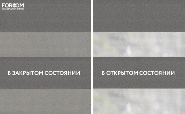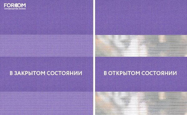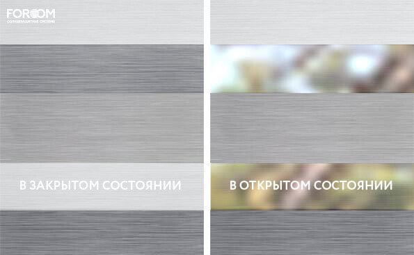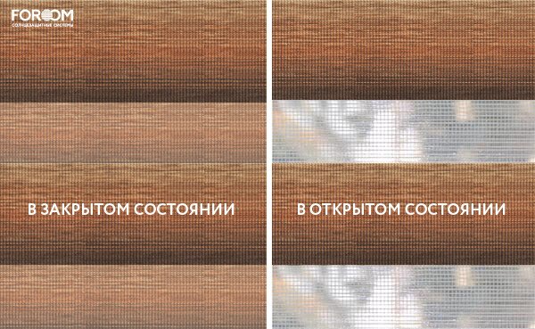 Каждый слой ткани имеет чередующиеся непрозрачные и прозрачные полосы. При смещении полос друг относительно друга можно добиться полного затемнения («ночь», когда непрозрачные полосы совпадают), максимального светопропускания («день», когда совпадают прозрачные полосы) или промежуточных режимов, создавая эффект «зебра».